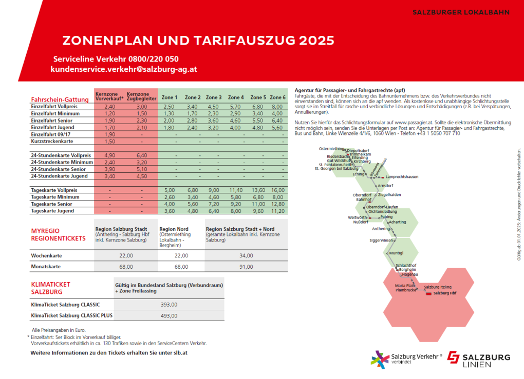 Weitere Ermäßigungen lt. Tarifbestimmungen erhalten Sie mit dem jeweils gültigen Ermäßigungsausweis. ÖBB-VORTEILSCARD in Verbindung mit einem gültigen Lichtbildausweis und werden auf der gesamten Schienenstrecke anerkannt. Bei der ÖBB-VORTEILSCARD Senior wird der SVV-Tarif verrechnet. Bitte beachten Sie, dass Spezialangebote der ÖBB (wie z. B. Einfach-Raus-Ticket usw.) bei der Salzburger Lokalbahn nicht gelten.