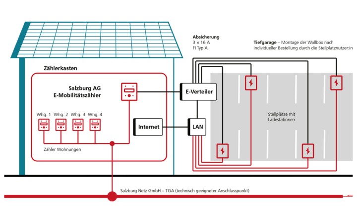 Machen Sie mit der Charge.Community Ihr Gebäude zukunftsfit. Errichten und betreiben Sie eine Gemeinschaftsanlage mit Lastmanagement, die alle Bewohner:innen nutzen können. Die Abrechnung der benötigten Energie erfolgt dabei komfortabel direkt zwischen der Salzburg AG und den Stellplatznutzer:innen.