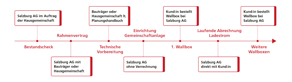 Die Stellplatznutzer:innen schließen individuelle Kaufverträge für eine Wallbox sowie einen separaten Dienstleistungsvertrag für die Abrechnung des Strombezugs mit der Salzburg AG ab. Die Wallbox wird von der Salzburg AG am jeweiligen Stellplatz installiert und die benötigte Ladeenergie wird über die Ladekarten direkt mit den Kund:innen abgerechnet.