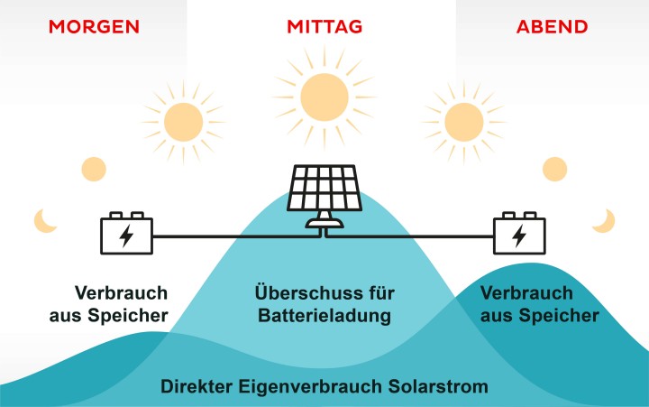 Die meisten Privathaushalte haben besonders morgens, nachts oder an dunklen Wintertagen einen hohen Bedarf Strom zuzukaufen. Solarstrom kann erst bei einer höheren Sonneneinstrahlung produziert werden. PV-Anlagen erzeugen also genau dann viel Strom, wenn weniger gebraucht wird und umgekehrt.
