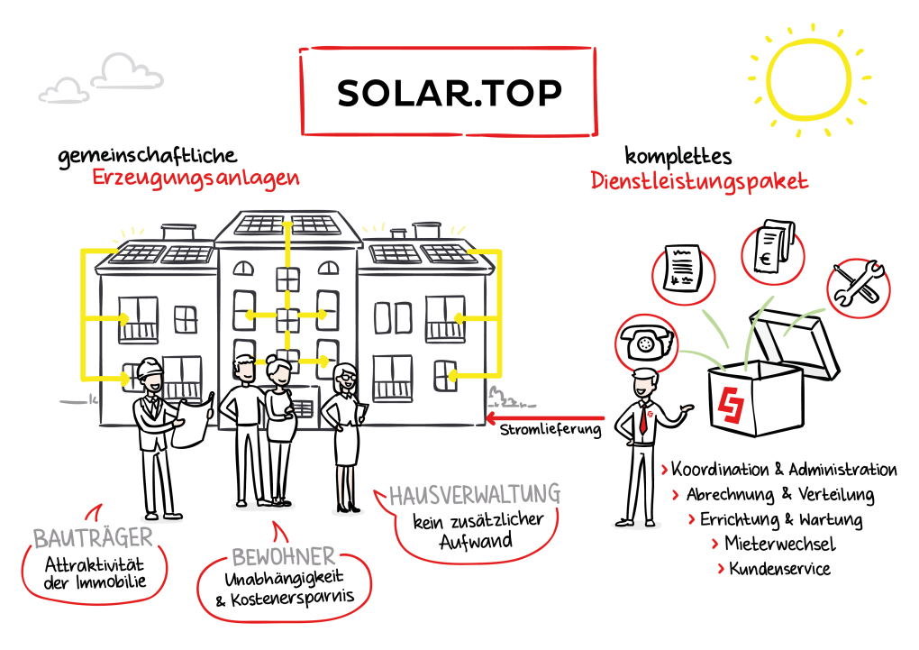 Mit solar.top wird Strom aus Photovoltaik-Anlagen auf einem Mehrfamilienhaus direkt an die Bewohner weitergegeben. Wir erledigen für Sie alles - von der Betriebsführung bis zur Rechnungslegung.